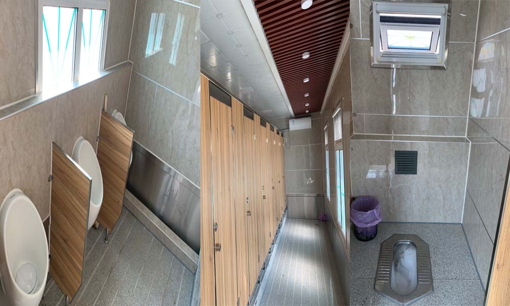 1、基本配置:不銹鋼自動開啟蹲便器、小便器、防滑火燒板地面、化妝鏡、衣帽鉤、手紙盒、廢紙簍、照明燈、換氣扇、指示牌等